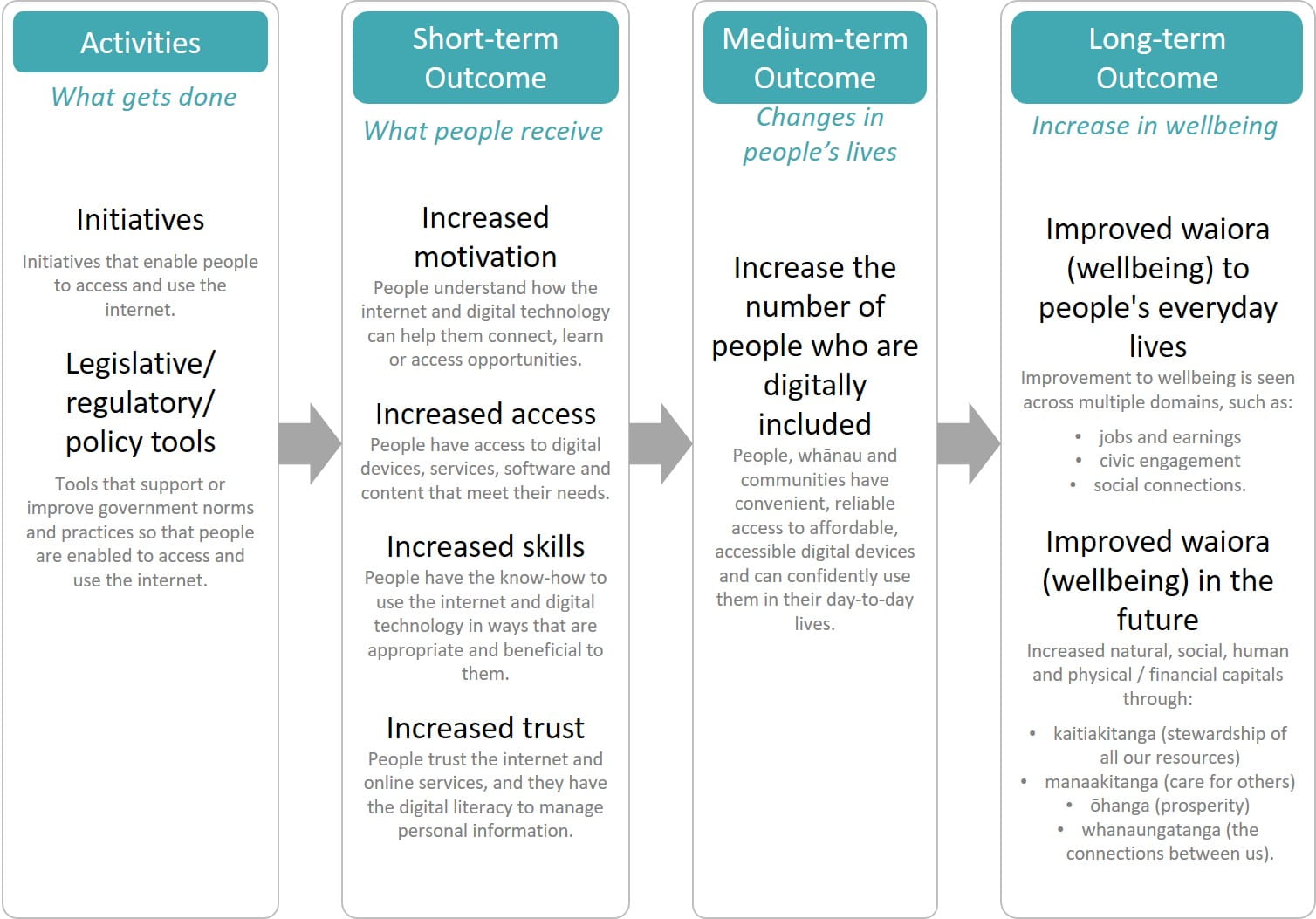This graph gives a visual summary of the short-term, medium-term and long-term outcomes government expects to achieve following the planned activities to remove barriers to digital inclusion in New Zealand.