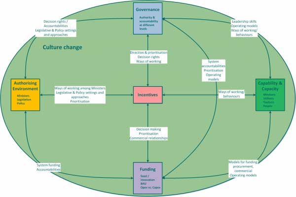 The updated diagram still has the same 5 key system settings (showing the elements in the system that involve how government works) – governance, authorising environment, capability and capacity, funding, and incentives.
