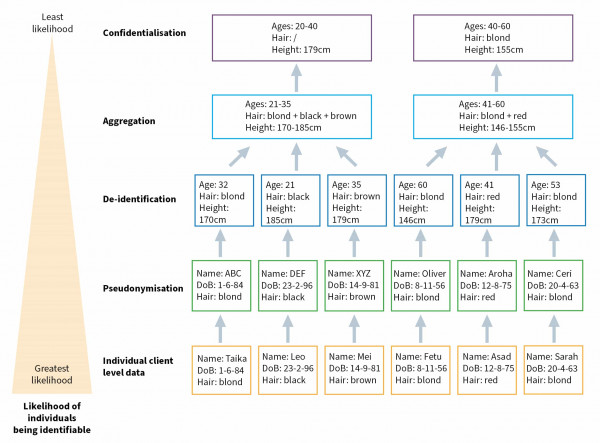 - Confidentialisation: This method applies statistical techniques to the data to prevent individual identification. For example, it may include the age range, and give the average height of the group, but then remove data about hair colour because an individual could be identified by it (as determined by statistical analysis).